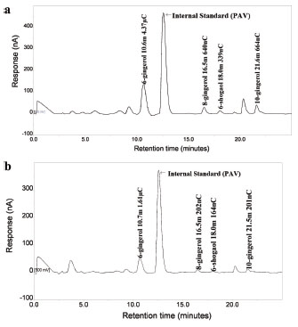 Previously, reported HPLC techniques for 6-ginerol had good reproducibility over the concentration range of 0.20 to 40 µg/mL using UV detection (13). The HPLC method reported here, uses electrochemical detection, which can help confirm peak identity, and has good reproducibility over the range of 0.10 to 5.00 µg/mL. The limit of detection is 75 ng/mL or less for gingerols and a limit of quantification of 100 ng/mL (except for 10-gingerol where the limit of quantification is 250 ng/mL). In human plasma, as shown in Figures 2 (a) and (b), the concentrations of some ginger analytes were below 200 ng/mL after ingestion of 2.0 grams of a ginger preparation indicating the need for sensitive analytical methods.